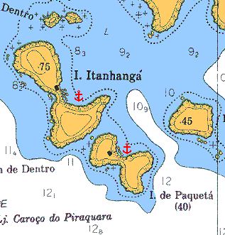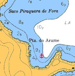 23°13.57'S; 44°38.5W; Dans 3 à 4 mètres sur fond de sable vasard de bonne tenue. |