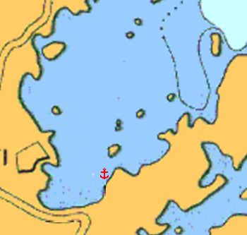 Au nord de la zone de corps morts, sur sable vasard de bonne tenue, sous 5 à 10 mètres d'eau. |