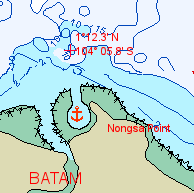 Sur Batam, plusieurs marinas existent. La plus directement approchable n'est pas sur les cartes ni les guides. Elle a été creusée dans le platier qui déborde Nongsa Point et une fois au point d'atterrissage indiqué, on distingue le chenal d'accès qui est bien balisé. Pour arriver à ce point depuis le Selat Riau (depuis le Sud) on laissera un large tour à toute la côte NE de Batam, jusque Nongsa Point. Le balisage délimite en fait deux chenaux. Prendre celui le plus à l'Est; l'autre conduit les ferry vers leur terminal qui est dans la rivière. |