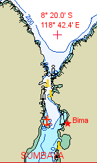Là, on entre dans l'univers des fjords. Froid en moins... C'est un assez joli paysage marin, il faut bien le dire... Ce fjord abrite Bima, qui est la capitale de Sumbawa. C'est une ville indonésienne musulmane classique: beaucoup de marchés, pas beaucoup de cafés... A part le marché, on doit pouvoir trouver de tout à Bima, mais il faut le chercher. Ou alors s'attacher les services d'un guide anglophone. Il y a quelques candidats. Le quai commercial est un peu "fouillis" et le trafic des caboteurs est important. En plus ça assèche plus ou moins tout autour... Histoire de dire que l'accès à terre n'est pas évident. D'ailleurs il y a beaucoup de petits bateaux taxis qui viennent vous chercher au mouillage pour vous emmener à terre. |