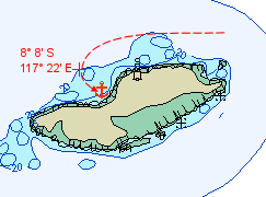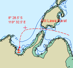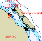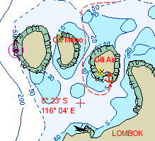 Si on arrive par le Nord, donner un laaaarge tour à l'W et au SW de Gili Air. Le platier déborde très largement le SE... c'est d'ailleurs ce qui fait son intérêt. Il faut y arriver par bonne visibilité, parce que l'entrée dans le trou du platier qui forme le mouillage n'est pas balisé. Comme les fonds remontent abruptement sur ce platier, le sondeur n'est pas d'une aide efficace. Arriver à marée basse doit améliorer la visibilité de la passe.. |