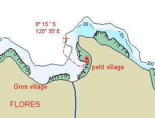 Mouillage de lagon!! Si si, c' est vrai.. De l' eau claire comme on avait pas vu depuis longtemps, derrière des bancs de sable et quelques îlots qui forment une barrière. On se croirait dans les tuamotus... Là, non j' exagère, ce n' est que le passage à terre de quelques îlots et bancs de corail qui bordent de très près l' île d' Adonara, au cap Magawutun. Mais après 4 jours de navigation depuis Saumlaki et la traversée de la remuante mer d'Alor, ça paraissait bien accueillant. Un très petit village de pêcheurs sur la côte... Et dans l'ouest de l' abri d'un petit îlot et de bancs de sable, la nuisance: des fermes piscicoles occupent tout l'espace... Du coup on conseillerait de mouiller un peu plus à l' ouest, sous les gros îlots. |