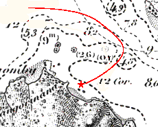 visiblement de la côte. On mouille juste au N du troisième rocher, sans trop s'approcher de la côte qui est assez largement débordée de pointes rocheuses découvrant à marée basse. |