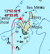 C'est la première île que nous ayons aperçue en arrivant des Seychelles. Avec ses falaises d'orgues basaltiques, c'est un endroit plutôt sexy. Quelques villages sont répartis au bord de la baie, mais ça ne fait pas très peuplé. En fait, Mistsio est un petit archipel, avec une île beaucoup plus grande que les autres. C'est de celle là que nous parlons: Nous ne sommes pas allés visiter les autres. Je crois bien qu'on y trouve un ou deux "resorts". La baie de Maribe que nous décrivons est large, bien abritée des vents dominants et en particulier des thermiques de la saison sèche. |