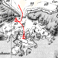 Informations d' accès | La seule difficulté réside dans le platier qui déborde très loin vers le nord la pointe E de l'entrée. On donnera donc un grand tour à cette pointe en approchant l'entrée au 170, et en favorisant plutôt la partie W qui est plus acore. Une deuxième difficulté possible, si on vise le mouillage sous la pointe W de l'entrée: il faut contourner par le sud un banc de sable déborde assez largement au S de cette pointe . Il est malgré tout assez visible car l'eau est plutôt claire à cet endroit. |